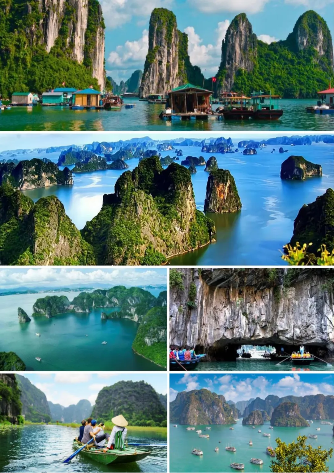 早餐后,乘坐越南特色红木船出海 ,船高两层 ,可上二楼甲板自由欣赏大自然的鬼斧神工 。漫游世界八大奇迹之一的 -- --下龙湾 ,近距离触摸这一令人心旷神 怡的世界自然遗产( 在 1500 多平方公里的海面上、耸立着 3600 多座大小不一 、 千姿百态的喀斯特地貌 的山石、下龙湾以其“海美、 山幽、洞奇 ”三绝而享誉天下 )。乘船观赏一座座的独立仙岩 :大拇山、青蛙山、 天鹅山等千姿百态的山石引入眼帘。午餐安排于船上进行 ,品越南渔民特色餐 。