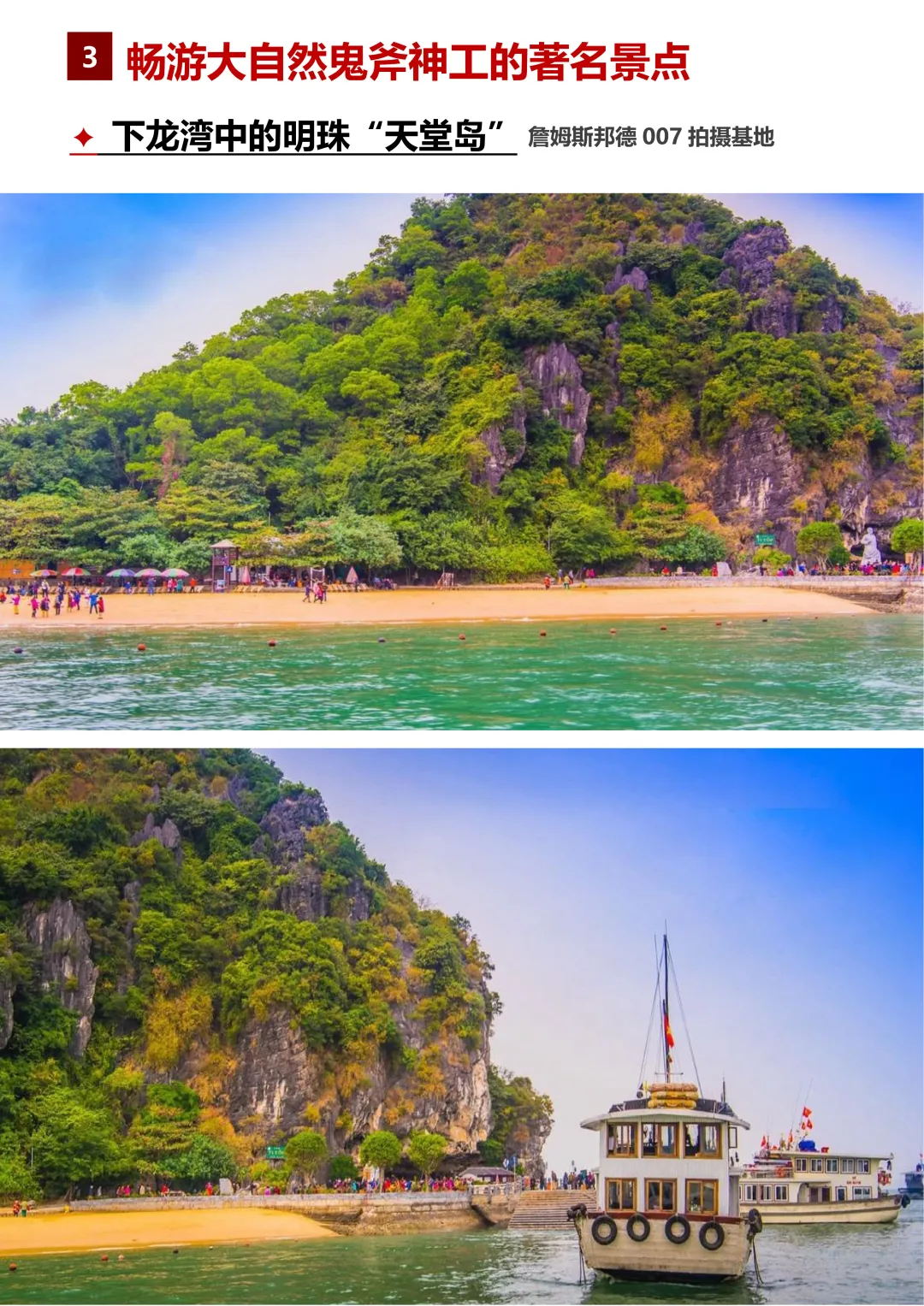 后前往越南最浪漫、最漂亮的岛屿【天堂岛】,天堂岛是下龙湾唯一有沙滩的岛屿,金黄色的沙滩,蔚蓝色的海水,仿佛置身世外桃源一般,登上天堂岛,领略“会当凌绝顶,一览众山小”的感觉,环顾四周,如同进入蓬莱仙境。返回码头下船 ,入住酒店。