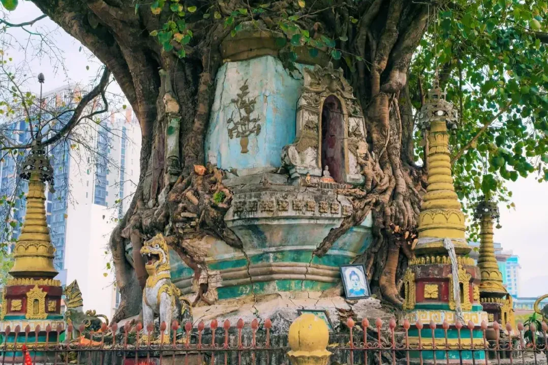 ◈后前往【树包塔】是一种独特的自然与人文景观,通常是指古塔与榕树等树木相互缠绕、融合,形成树包裹塔的奇特景象。位于芒市步行街中段,傣语称“广母姐列”,意为“铁城塔”。它始建于18世纪中叶,是芒市第十五世土司放作藩为纪念一场大胜的战争而建,后经十九世土司放承恩重修。此塔系砖石结构,塔座呈八角状,塔身为串珠形圆锥体,高十余米。百余年前,塔缝中长出一棵榕树,树根逐渐将塔缠绕包裹,形成树包塔奇观。它被傣家人视为“爱情塔”,也是云南省级名胜古迹和重点文物保护单位。