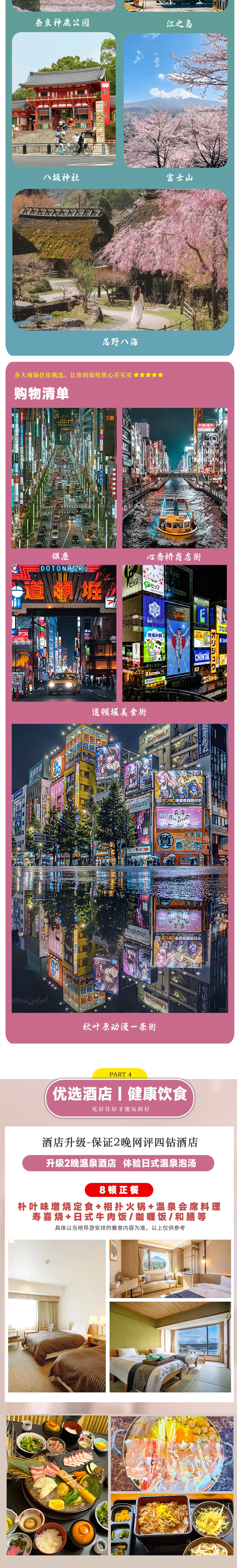注:由于日本旺季酒店及用车紧张,如遇交通堵塞及不可抗力等其它因素,我社保留对行程景点以及餐食内容、顺序及行程时间安排调整的权利,所有景点导游会根据当天的天气和路况进行顺序调整。另外樱花花期受天气气候条件(如温度、雨水、风况)影响显著,其盛开状态具有天然不确定性,我社提供的花期开班日期基于往年数据的预估,并非保证条款,望理解。
