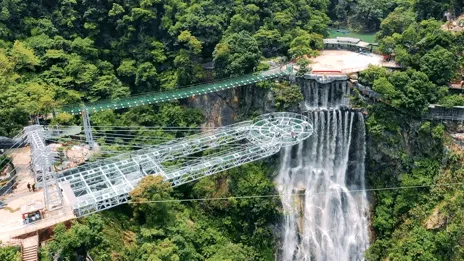 【云天玻霸】又名玻璃大峡谷,是世界首个集悬空玻璃平台、玻璃悬廊、玻璃栈道、玻璃吊桥、玻璃天镜、玻璃直播间6位一体的玻璃观光组合,6大玻璃项目悬浮在古龙峡高度530米的群山之巅、瀑布之上,从悬崖绝壁凌空而出,全长1300米,面积1.2万平米,气势磅礴。云天玻霸包揽了世界最大的高空玻璃游览线路、世界游览面积最大的高空玻璃组合、世界最多空中项目等多项世界纪录,问鼎世界高空游览新霸主,是名副其实的天空之城。世界最高的户外扶梯从峡谷中部直达云天玻霸,2分45秒即可抵达玻璃桥头。云天波霸(送登峰电梯)包含四大项目:玻璃吊桥、栈道、悬廊、平台及古龙秘境大瀑布群一票通玩!
