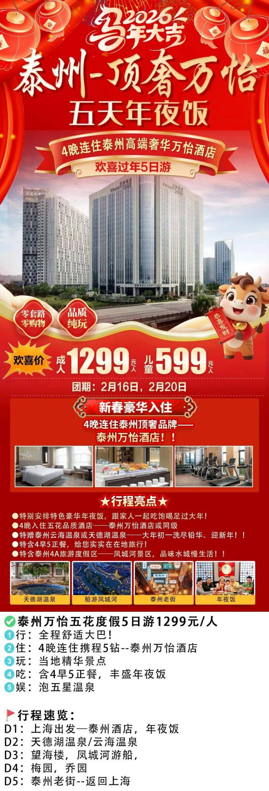 D1:上海中午12:00指定地点出发(具体地址以工作人员通知为准)赴泰州,前往酒店办理入住,晚餐享用丰盛【年夜饭】,结束后可以在房间内观看央视春晚。