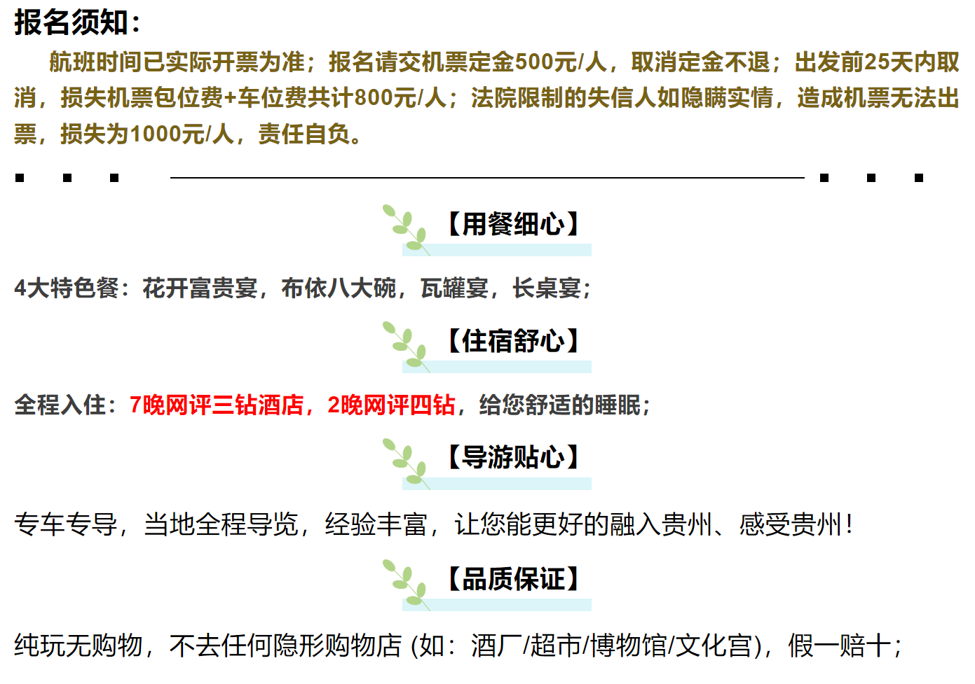 5.游客参团必须认真阅读本行程,确认本人身体健康状况适合此次旅游活动,承诺如本人疾病突发出现健康方面意外导游仅有组织抢救、送医责任,其它责任与旅行社无关、请考虑自身身体状况再报名参团前往目的地旅游。