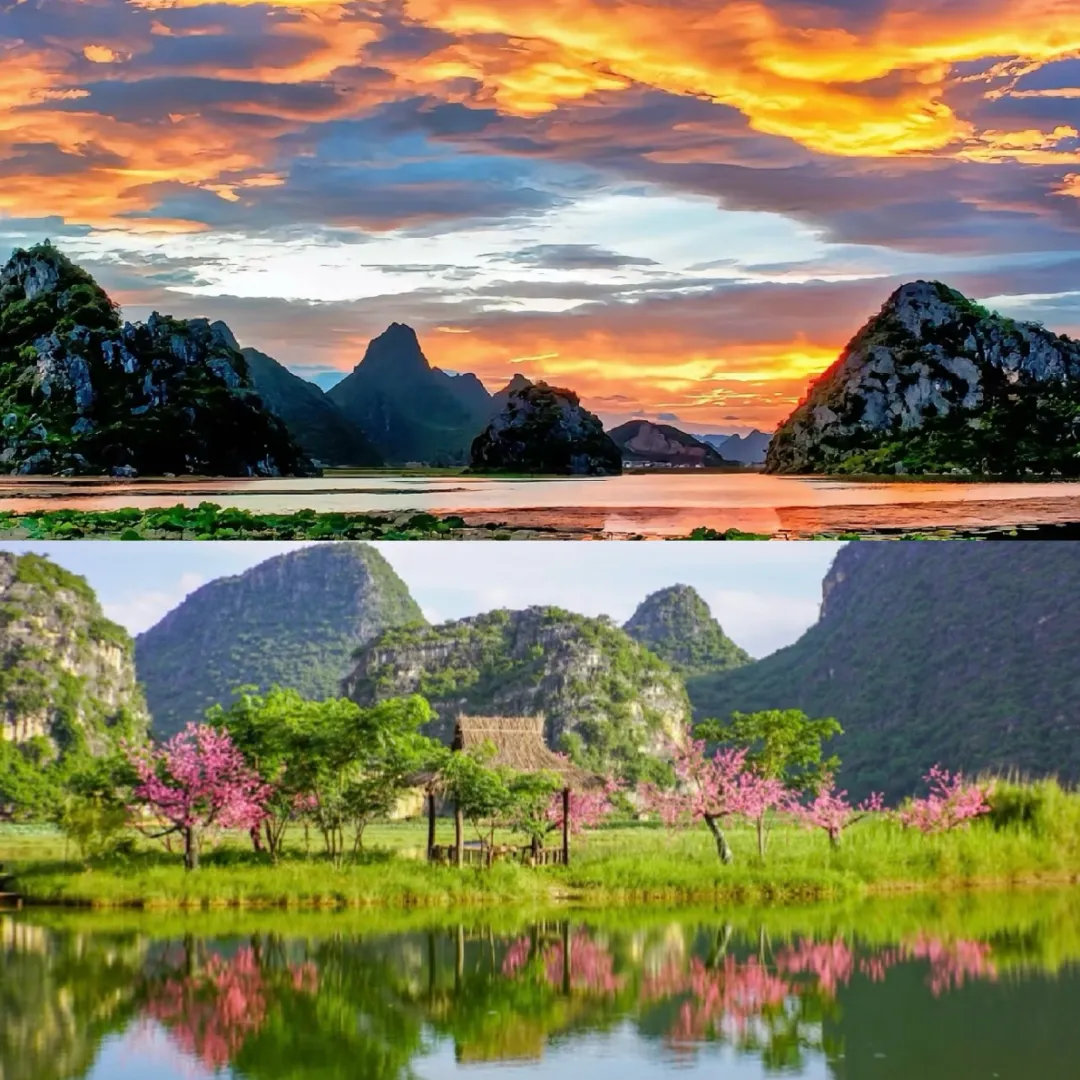 早餐后,乘车前往游览-【坝美广场】【世外桃源】【桃花林】观【猴爬岩】(门票,三段游船90、电瓶车50为必消小交通自理)风景区游览,“林尽水源,便得一山,山有小口,仿佛若有光,便舍船从口入。”来到坝美,靠潺潺溪流指路,溯流而上就会看到一个状若巨笔的石山(坝美村的入口),在昏暗的水洞中穿行,一束光后,便可看到洞口吱呀作响的水车 ,壮族少女婀娜的身姿。拾级而上,眼前顿时豁然开朗,淡蓝色的驮娘江在不远处向招手,碧绿的田野间农人耕作,翠竹、桃林深处有人家!