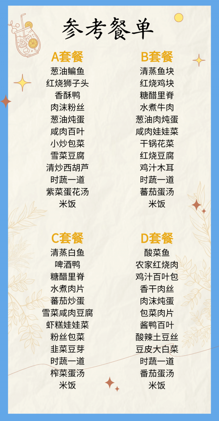 用餐:赠2顿苏轼早餐、4顿正餐 (6人以上桌餐,6人以下餐券抵扣)