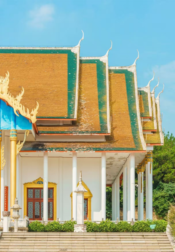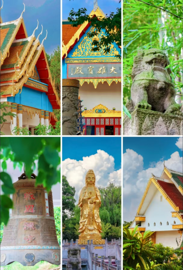 泰式建筑风格的寺庙。溧阳报恩禅寺,免费开放,被称“溧阳小清迈”,是天目湖北岸的千年古刹。南朝梁代始建,1994年迁址重建,中式布局融合泰式金顶白墙,鎏金雕花配蓝门匾,异域感拉满。核心看点:大雄宝殿檀香木佛像、500罗汉廊、唐石刻井栏、“龟驼经”镇寺之宝,放生池双面镀金观音亮眼 。 d338b901b0d37ca0d6914b84cb4ecbac286769713b147194e679db3597e7d284