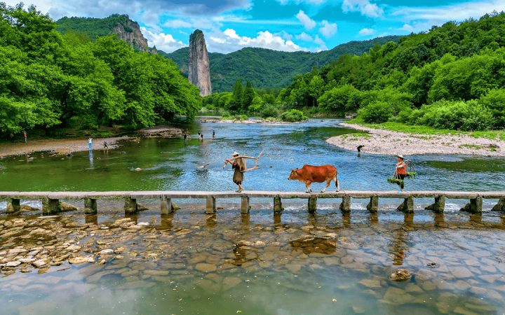 景区六大景点:朱潭峰、鼎湖峰、倪翁洞、仙都观、小赤壁、仙都石窟群,朱潭山曾经被一张老人牵牛的照片火遍摄影界。