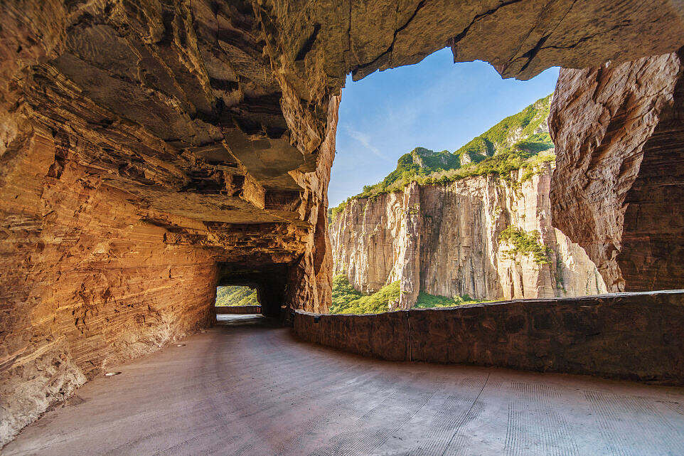 国家攀岩公园、国家地质公园、国家森林公园,换乘景区观光景交到达中华影视村【郭亮村】。郭亮村三面环山,一面临崖,近乎绝境,被称为“世界上最危险的村庄”;【郭亮村影视城】先后有《清凉寺钟声》、《倒霉大叔的婚事》、《举起手来》等40多部影片在此拍摄。沿绝壁行走可看红岩绝壁大峡谷,峡谷宽5-500米,堪比美国科罗拉多大峡谷,两旁绝壁深130多米,长40公里,如刀劈斧剁,演示色泽赤红。游览被誉为 “世界第八大奇迹”红岩绝壁长廊,郭亮村绝壁长廊又称郭亮洞,全长1250米,始建于1972年,全部由郭亮村十三位村民历时6年独立手工开凿完成,郭亮洞被称为"世界最险要十条路"之一、"全球最奇特18条路"之一。