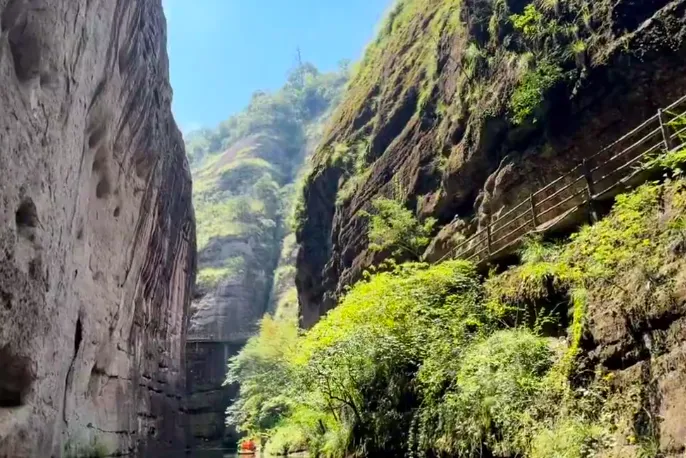 植被茂盛、峡谷纵横、丹霞绝色,融合了“湖、溪、山、谷、岩、峰、沟”的精华,“幽谷水巷、龙潭三峡”为景区景观最大特征。乘竹筏游于其中,身边的山谷、溪涧、草木,就像一幅流动的水墨画,置身其中,每个人都成了最幸福的水墨画中人……