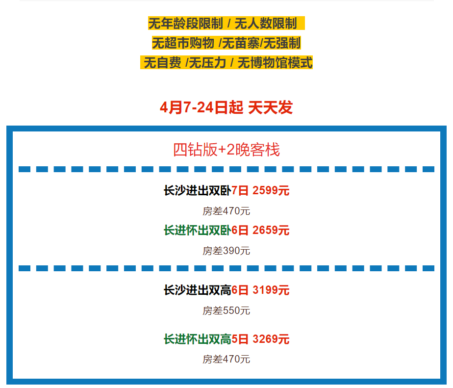 (1)此行程此报价按景区优惠门票核算,任何人群和证件都无优惠退,小孩按成人报名不占床不退费。
