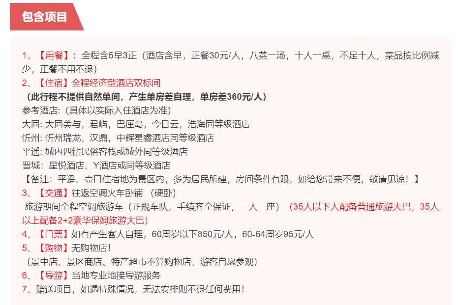 2、 本线路为散客综合报价、房差只补不退;原则上我社不保证安排三人间,如出现单人且酒店没有三人间和加床的情况下,敬请补房差;