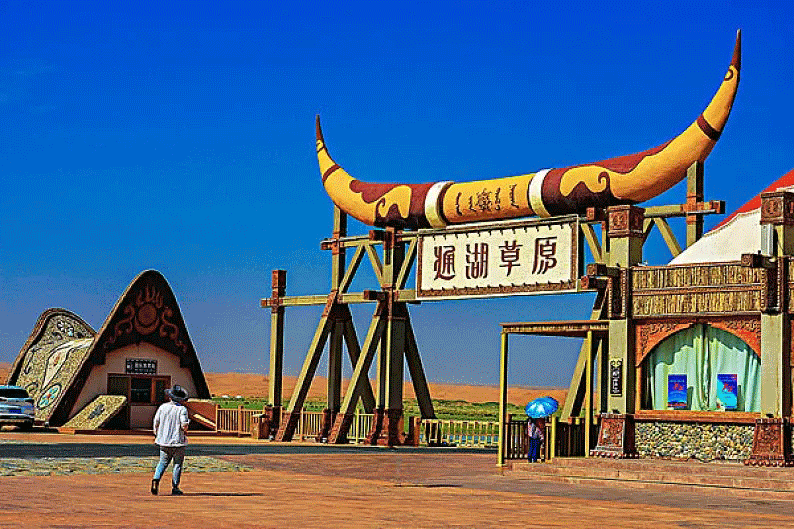 【通湖草原】(参观时间 3 小时)一到这里蒙古姑娘双手捧起蓝色的哈达 ,就能让您感受到腾格里大漠 腹地蒙古人民的热情,让你的热情释放在这迷人的沙漠,各位贵宾可自由在这里选择沙漠草原上特的娱乐项目。