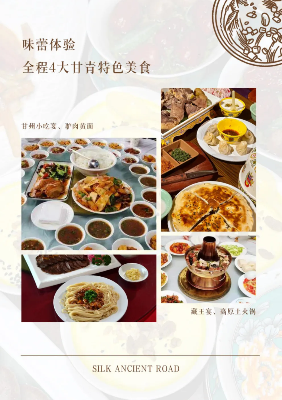 【食】1、西北团队餐主要以牛羊肉为主,口味偏重,较辣。主食以米饭、花卷为主。2、西北大部分地区气候干燥,为增强抵抗力应加强蔬菜水果摄入,切忌无节制地食用羊肉,建议多喝水,吃水果要少食多餐。另为预防肠胃不适,请自备常用药品。3、藏区的酥油茶之类食品不太适合内地人肠胃,不能多吃。当地有待客的酥油茶空碗必重新添满的习俗,故建议始终保持碗内酥油茶三分之二满,如此既不伤害藏民感情又保护自己,建议携带黄莲素之类止泻药。4、青海、宁夏、新疆的许多地方都是各族穆斯林聚居区,在任何清真餐厅就餐注意不要带入非牛羊肉的外食,不要饮酒,尽量不要浪费食品。