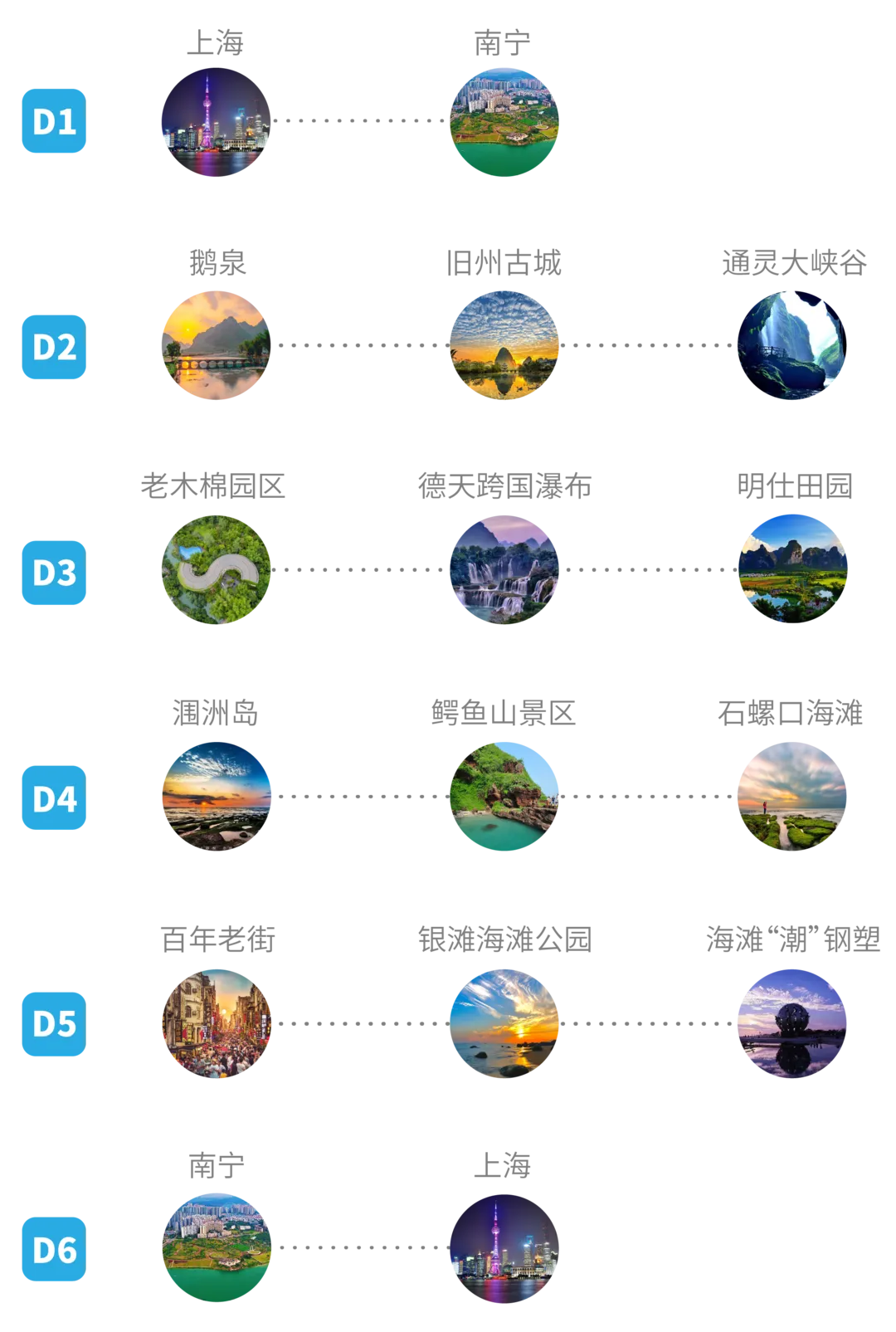 ★此次全景中越边境双飞6天深度游横跨广西西南部,旅途总里程数近一千公里,从南宁到百色靖西、崇左大新,最后到北海,沿途皆是优质金牌景点,包括内地自然奇观、《中国国家地理》评选的边境世界级大瀑布、《花千骨》《我们十七岁》热播剧取景地、壮族特色建筑及美食、海滨沙滩、北部湾美景等。
