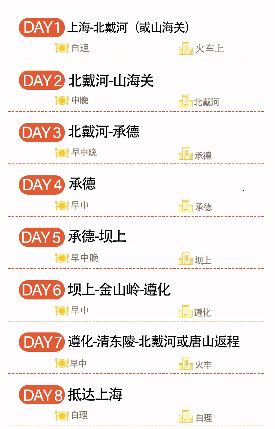后车赴北戴河或唐山火车站(乘T134;19:48或21:14/次日13:00或K688;21:48/次日16:21或Z174;23:57/次日13:14等车次)返回上海。