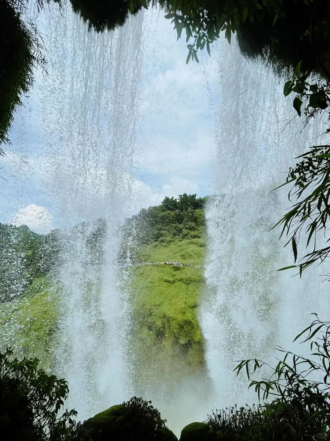 黄果树瀑布独有奇特之处就是隐在大瀑布半腰上的【水帘洞】。水帘洞位于大瀑布四十米至四十七米的高度上,有六个洞窗、五个洞厅、三股洞泉和六水帘洞个通道。在水帘洞,从各个洞窗中观赏到犀牛潭上的彩虹,这里的彩虹不仅是七彩俱全的双道而且是动态的,只要天晴,从上午九时至下午五时,都能看到。