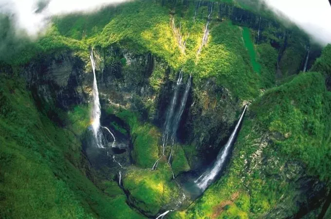 随后我们乘车前往大自然的圣殿【萨拉济冰斗】(游览约3小时),这里是一座拥有千条瀑布浇灌的青葱花园。它也是留尼汪三个冰斗中最大和森林覆盖最多的 ,也是最容易进入的冰斗。乘车前行两旁都是葱葱郁郁的热带植物 ,高高的山脉如城墙一般环绕四周 , 山泉河流从高处一泻而下, 形成大大小小的瀑布 ,其中最有名的则属【新娘头纱瀑布】(游览约1小时)。