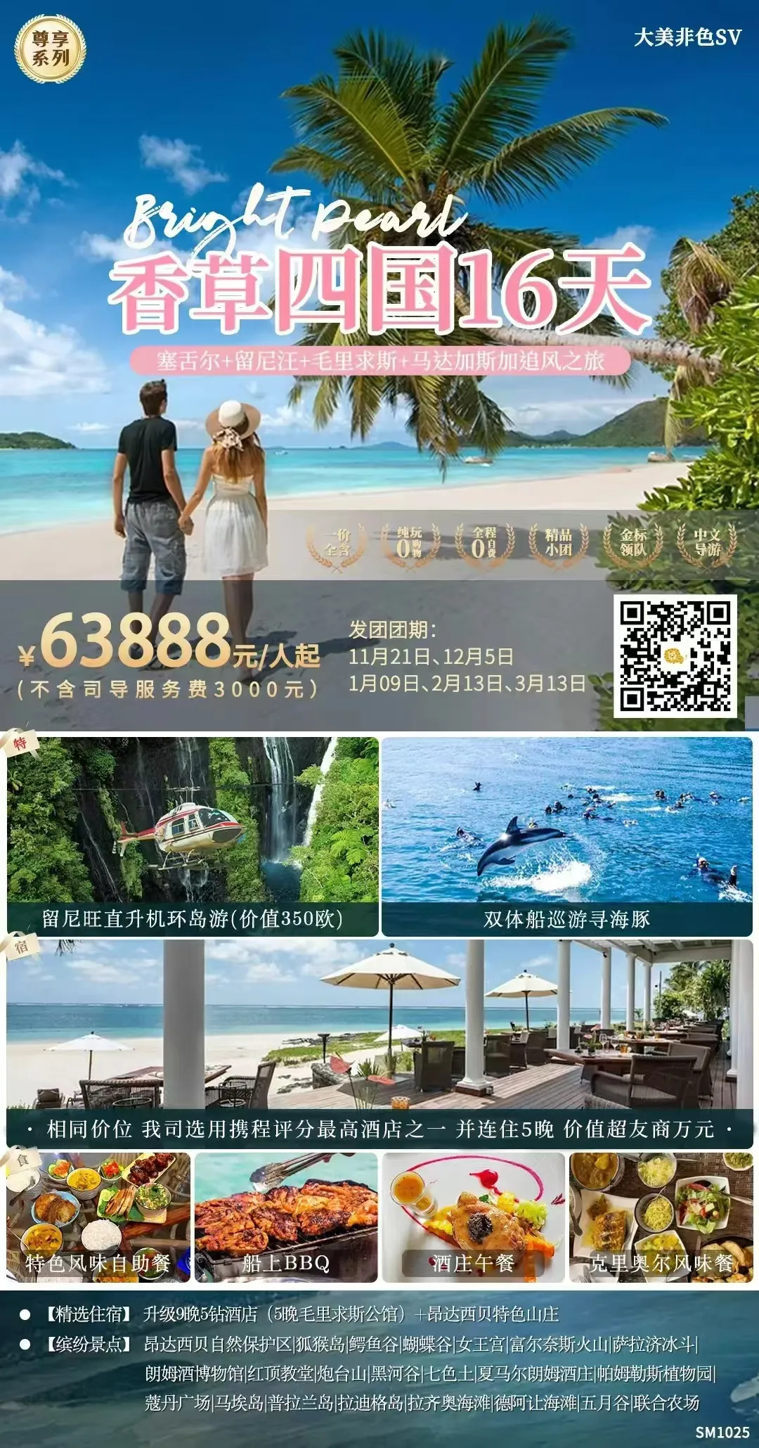 【特色安排】留尼汪直升机环岛游(价值350欧,飞行45分钟)、毛里求斯双体船巡游追海豚