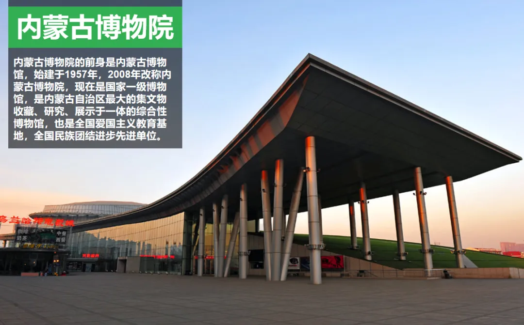 【内蒙古博物院】(参观内蒙古 60 周年大庆献礼工程,周一闭馆,可根据实际情况调整时间)是内蒙古自治区唯一的国家一级博物院, 也是国内外游客到内蒙古旅游、 领略内蒙古的历史与草原文化的重要“驿站”。集合了现代元素、地域表征与民族特色,楼顶塑有凌空奔驰的骏马,象征着内蒙古的吉祥与腾飞,该建筑从建成之日起就成为自治区首府标志性建筑之一。