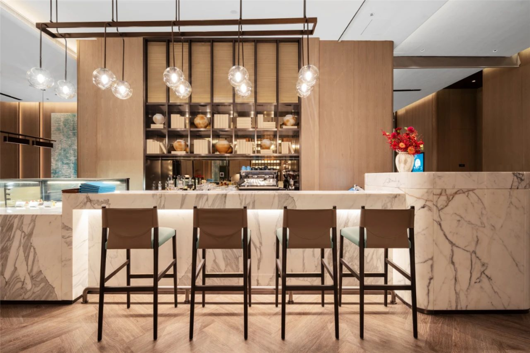 大堂前台的背景墙延续着青瓷釉色的美感,