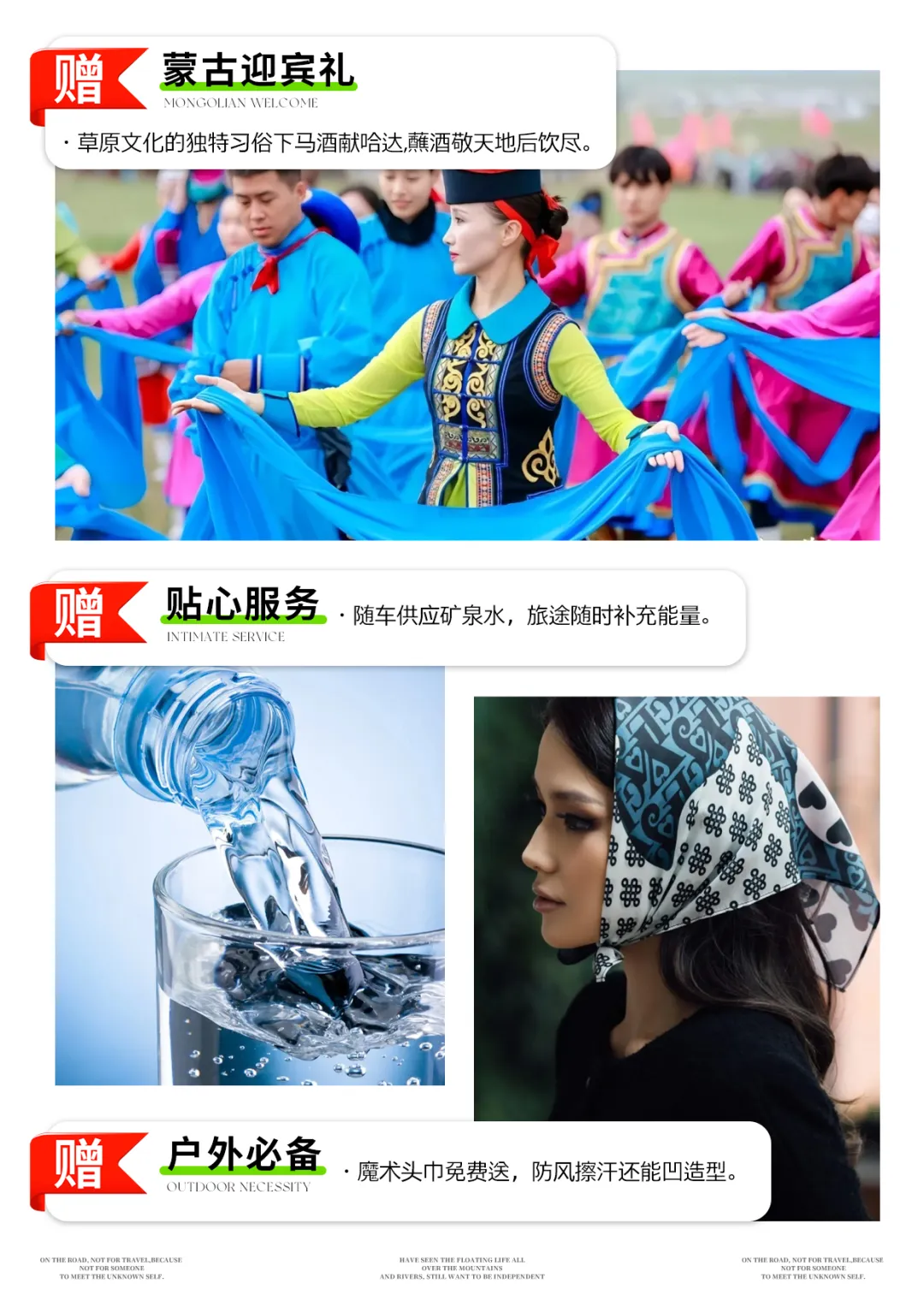 【赠送】帆船出海、游牧迁徙、草原之夜等赠送项目,不参加没有退费。赠送与升级为我社免费提供,因天气或人力不可抗拒原因有权做出调整取消,未参加者恕不退款,敬请理解;