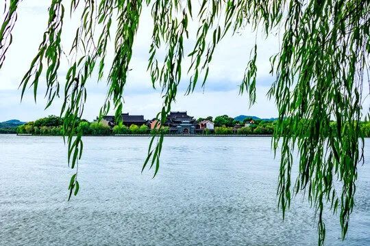 文昌阁的前面有一棵高大的枫香树。它好像是一把巨大的遮阳伞,根扎在岸边的石块里,枝叶却斜伸向水面,水边有一座石拱桥。树下有一条石阶步道,一直延伸到水的石拱桥处。