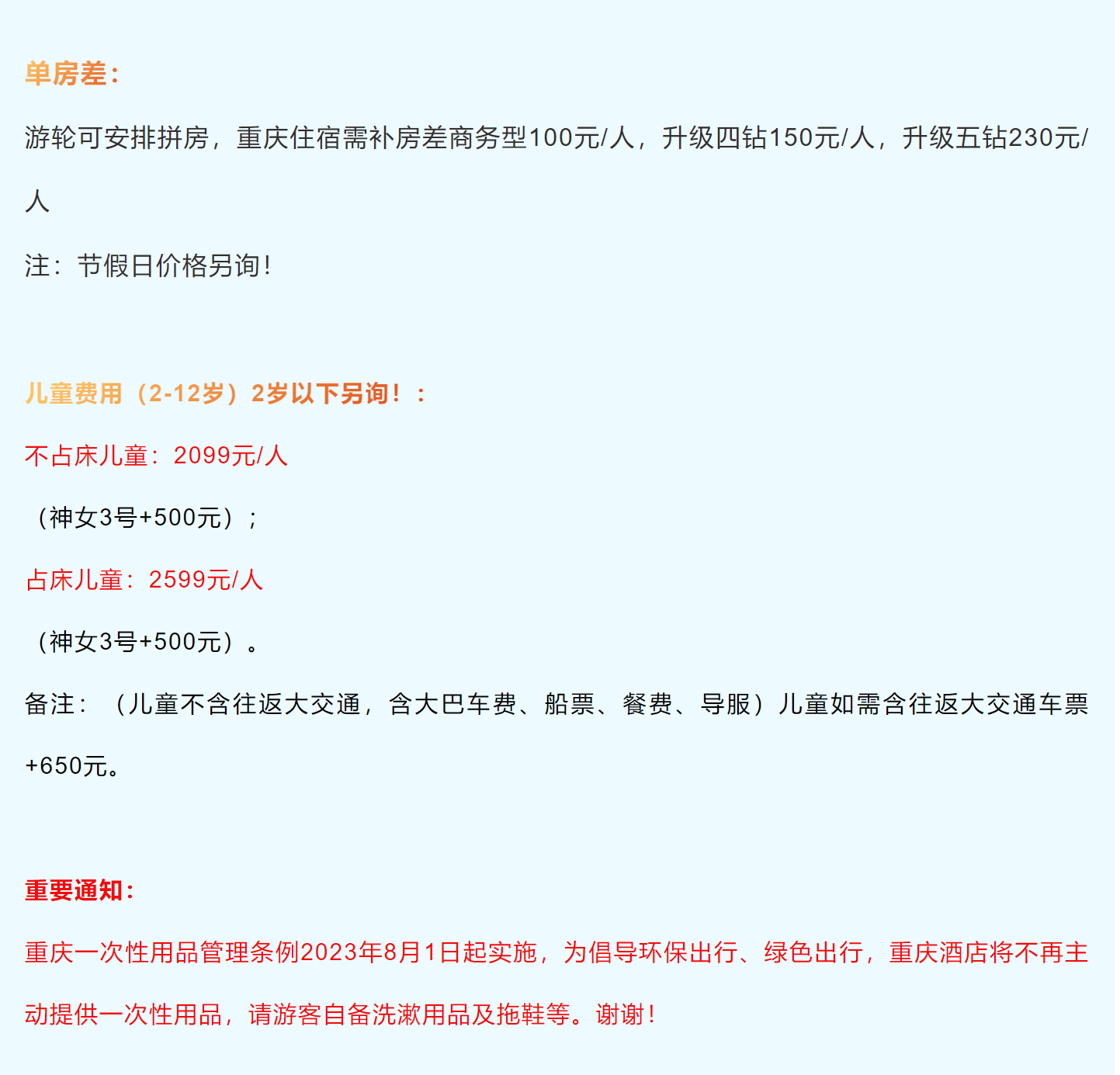 4、近期长江三峡各游轮收客火热,不接受口头预定,实名单占位确认,如有名单变更,按照上涨价格执行!