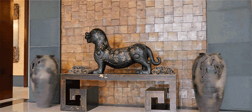 酒店外观低调大气,内里则精致细腻,充分展现了在地文化特色。大堂吊灯恰似将苏州的丝绸文化巧妙地融入了设计之中,宛若飘逸的丝绸,高雅柔美;大堂正中的虎符摆件、竹简、复古陶罐…呼应了穹窿山皇家文化、兵家文化。