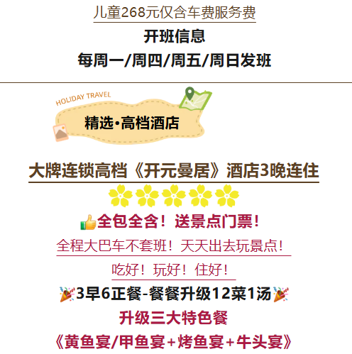 ◆1.2米以下儿童须买儿童价(只含车位、导服),产生其它费用请自理!