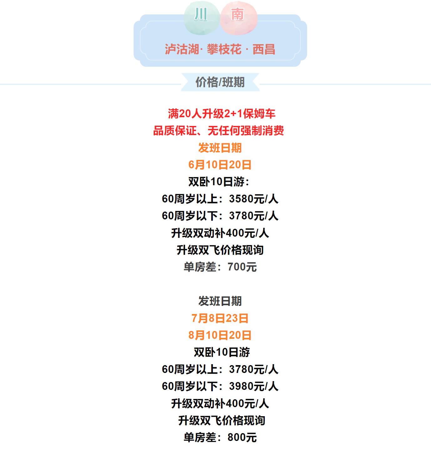 【住宿】:全程7晚酒店住宿:成都+西昌(网评3钻)+泸沽湖特色客栈 ;攀枝花升级4钻/4星酒店;