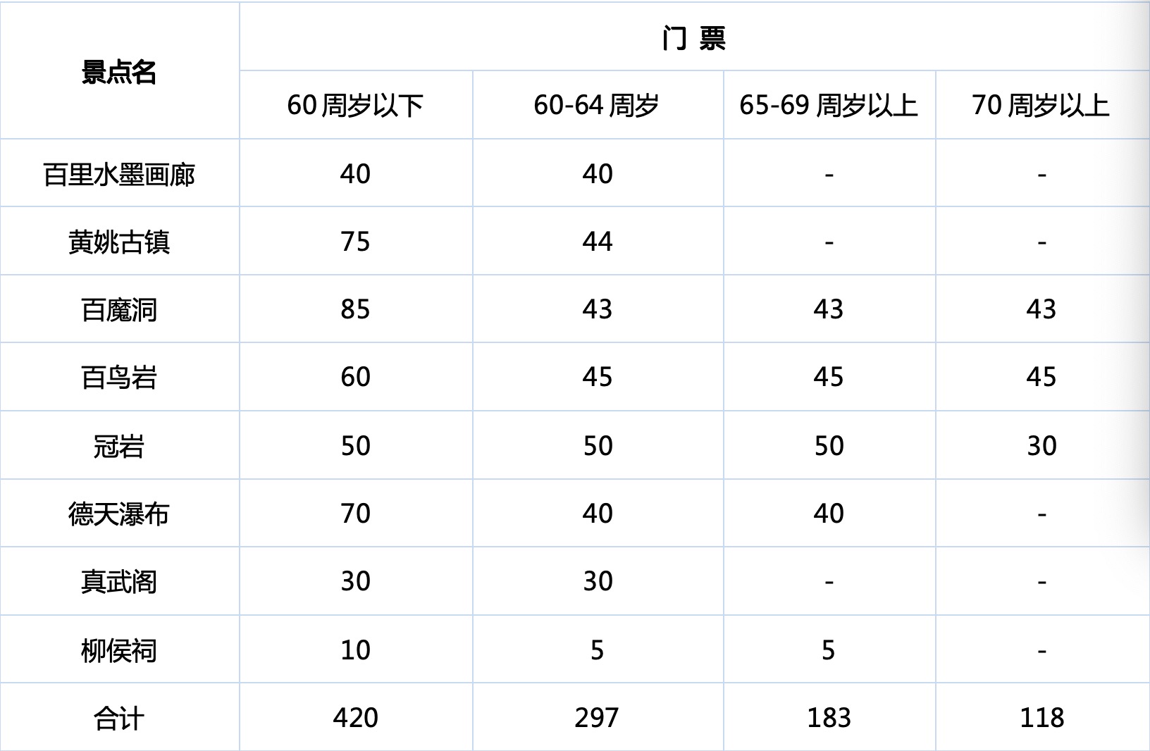 ■ 付费景点首道大门票补差: 60周岁以下678元/人,60-64周岁555元/人,65-69周岁441元/人,70周岁以上376元/人