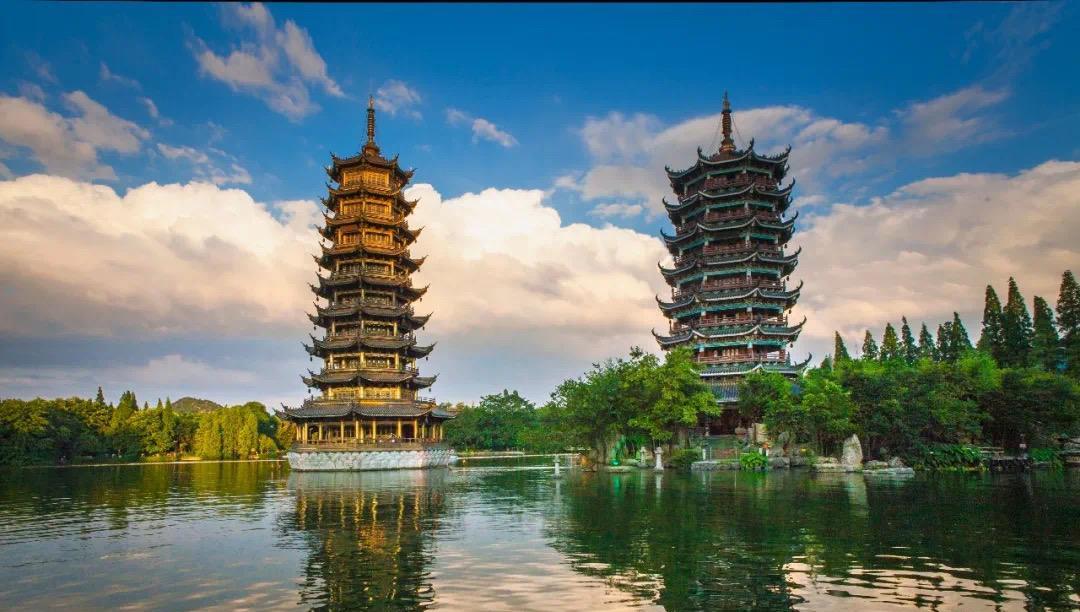 ◆ 桂林文化新地标【日月双塔】外观,国家AAAAA级景区,日塔、月塔与象山上的普贤塔、塔山上的寿佛塔,相互呼应,相互映衬,有“四塔同美”之说,桂林日月双塔号称世界第一铜塔。