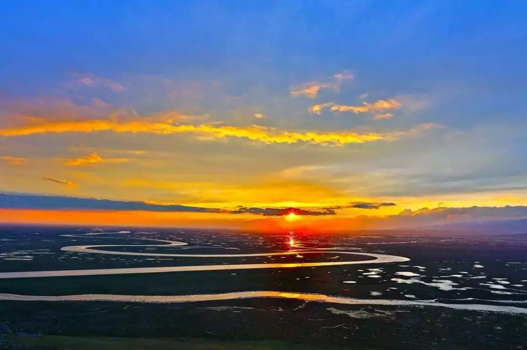 它像是泉水和雪水汇聚而成的仙女的飘带穿过天鹅湖,更像是上苍为巴音布鲁克这个翡翠王国披上的圣洁的哈达。当夕阳从云缝中把万道霞光射向草原,落日摇金,蜿蜒如蟒的九曲十八弯就映出了后弈射下的那九个太阳。