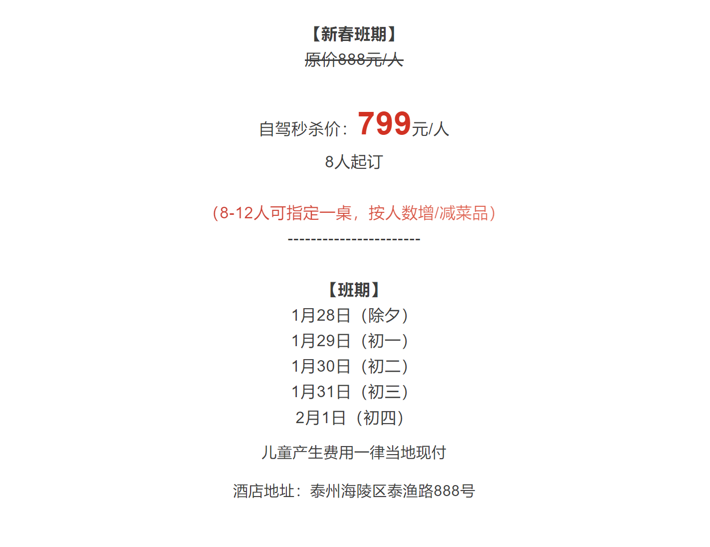 D1:自驾车前往泰州,抵达【泰州碧桂园大酒店】办理入住,下午自由活动,适时前往餐厅享用《价值1288/桌迎新晚宴》指定桌号,晚餐后自由活动。