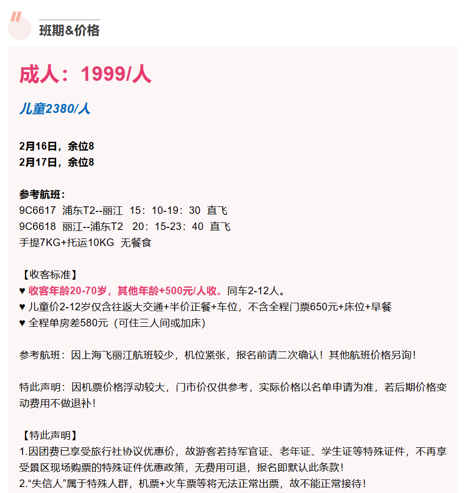 参考航班:因上海飞丽江航班较少,机位紧张,报名前请二次确认!其他航班价格另询!