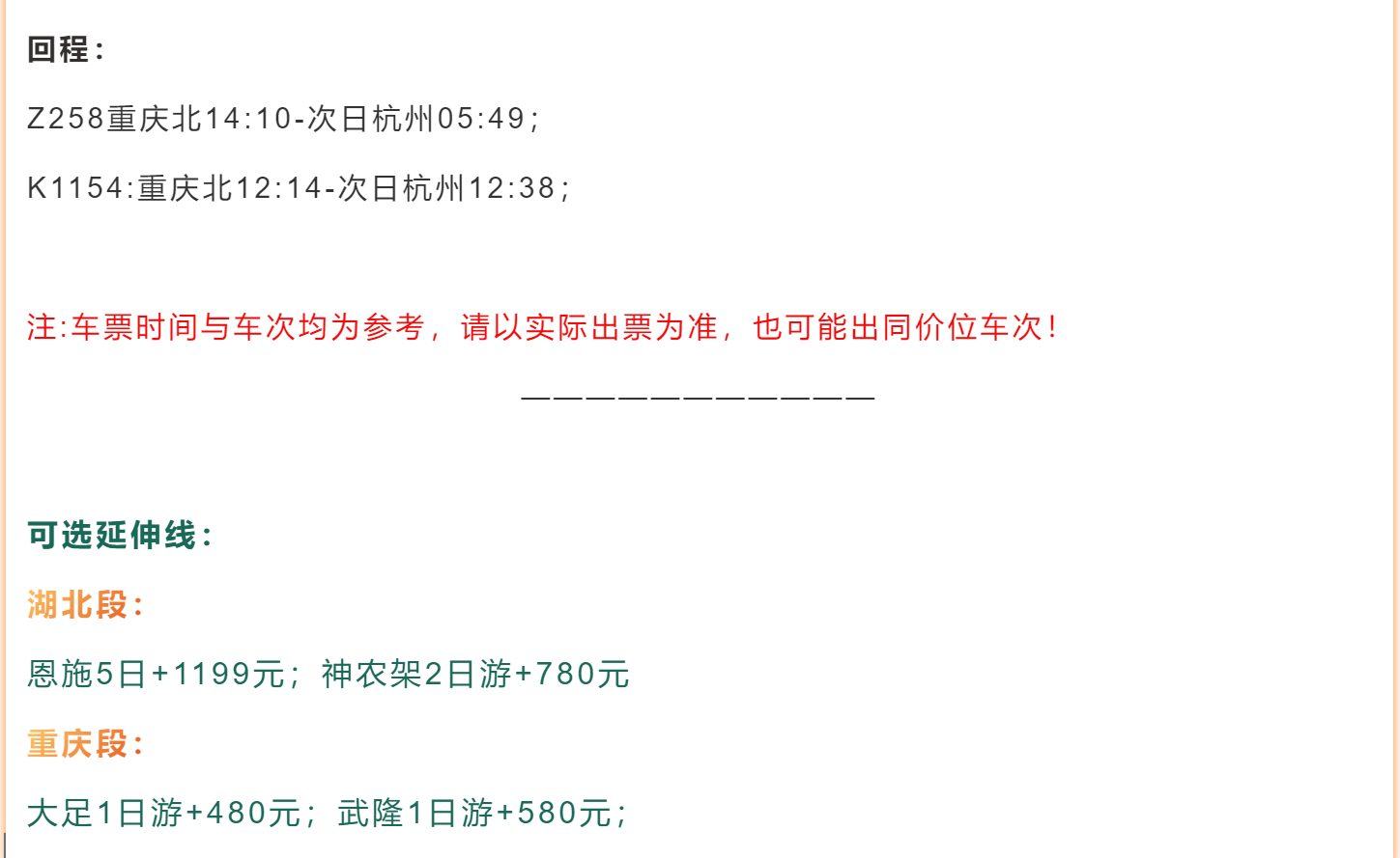 5、旺季4-10月不保证硬卧铺位,为了您有更好的旅行体验,建议+200元回程升级动车!