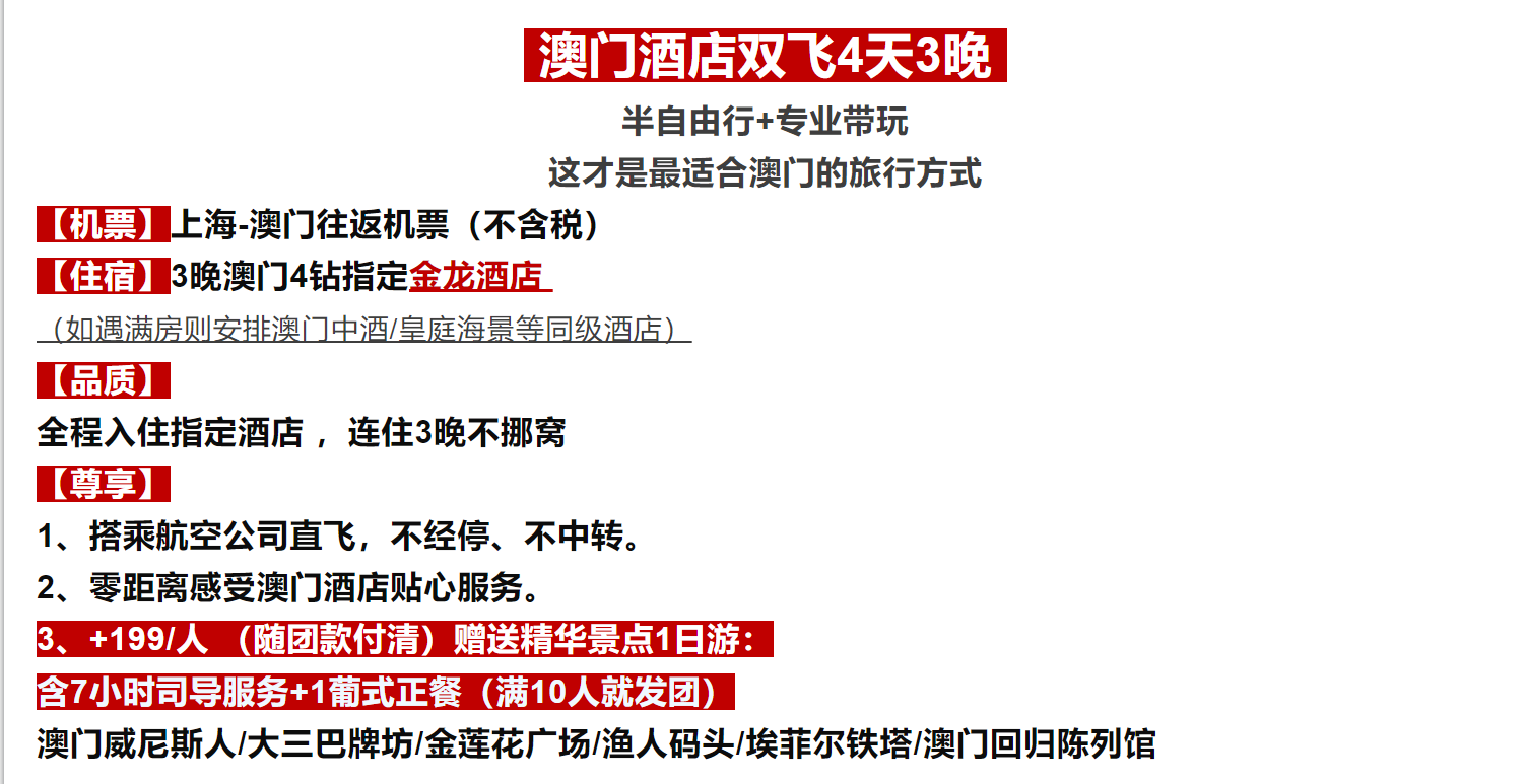 【交通】上海-澳门往返经济舱(不含税费+国际燃油费,以出票当天为准)。