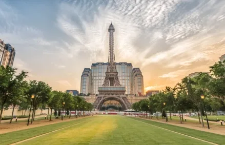 金光大道一带【巴黎人】澳门巴黎人是全澳门乃至亚洲的一颗闪耀新星,您可以在此感受“光之城”巴黎的独特艺术气息与迷人魅力。这里有约3,000间法式客房及套房供您选择,还有依照巴黎埃菲尔铁塔1/2比例建造的巴黎铁塔,让您体验独一无二的浪漫风情。