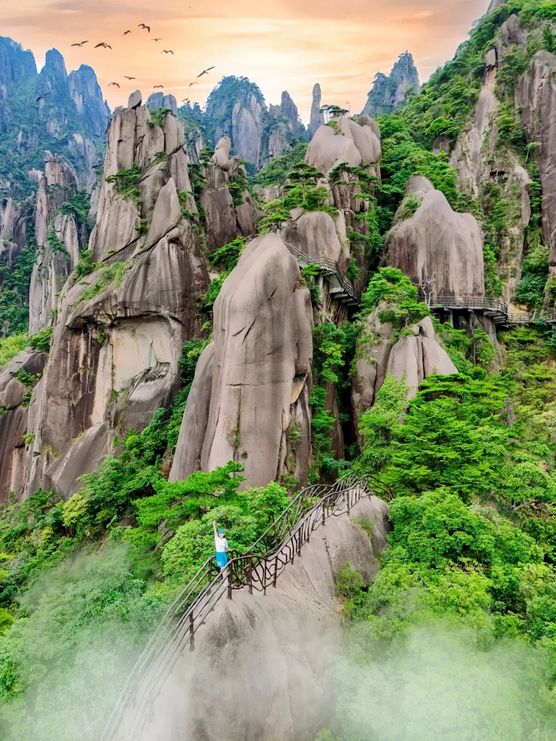 三清山东险西奇、北秀南绝,兼具“泰山之雄伟、华山之峻峭、衡山之烟云、匡庐之飞瀑”的特点,奇峰异石、云雾佛光、苍松古树、峡谷溶洞、溪泉飞瀑、古代建筑、石雕石刻各具特色,维妙维肖,形态逼真。