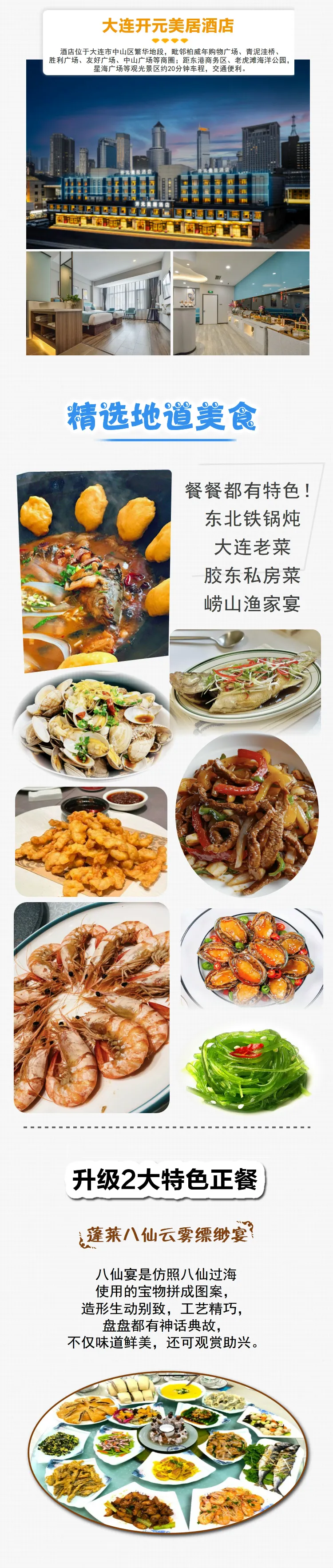 3. 用餐:全程含6早餐6正餐。升级2大特色餐【五星酒店海鲜自助餐+八仙过海宴】,品【崂山渔家宴&胶东私房菜&大连老菜&东北铁锅炖】;行程中所含餐食不吃不退!