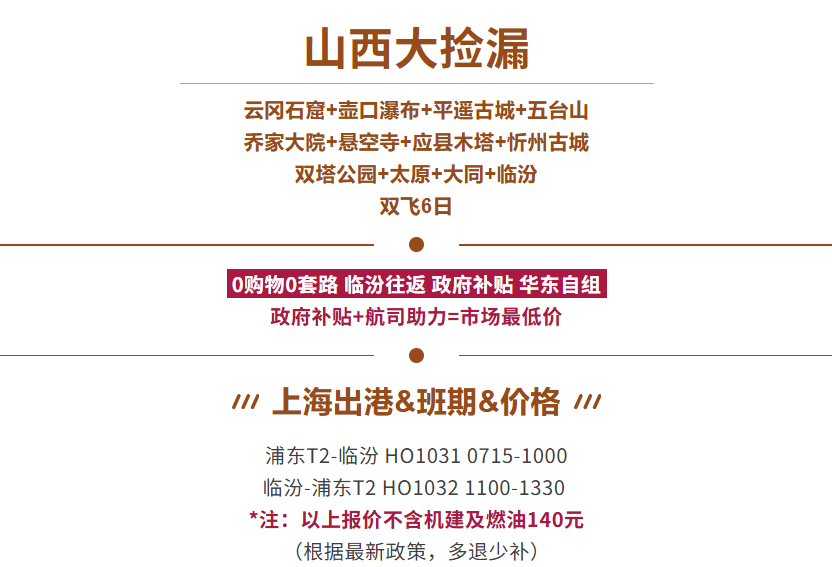①雁门关130元/人(此费用为用车+司导服务费。不含门票及景区交通,根据年龄政策景区现付)