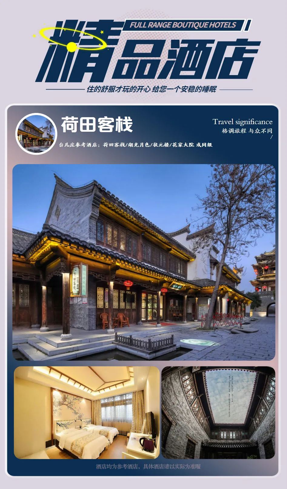 台儿庄参考酒店:荷田客栈/湖光月色/状元楼/花家大院 或同级
