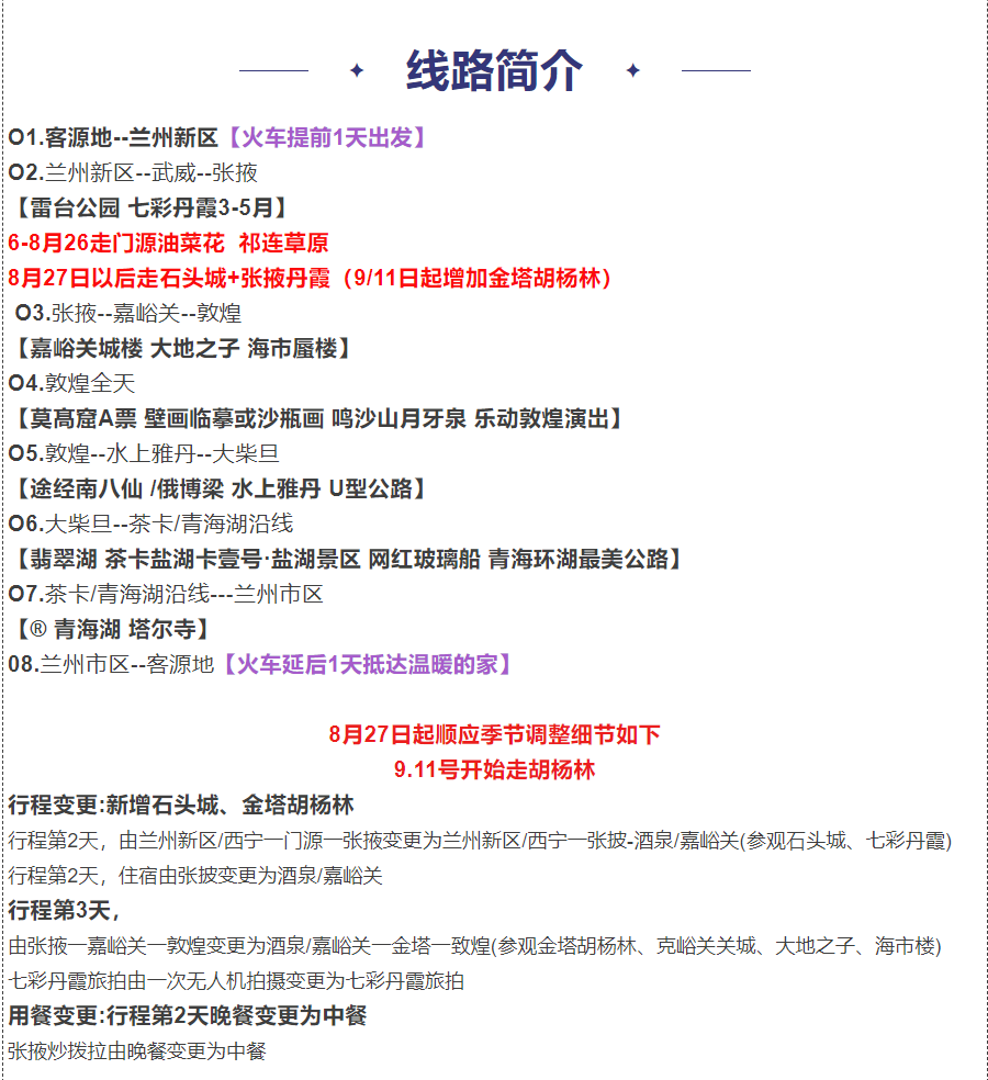 当天路途遥远、午餐时间比较晚、建议自备便携式干粮(牛奶、面包、巧克力、水果等食物)。七彩丹霞参观时,由景区北门进出,请在景区中乘车时注意景区交通车标识牌,进入景区需徒步走路参观 请各位游客穿平底鞋或运动鞋进入参观