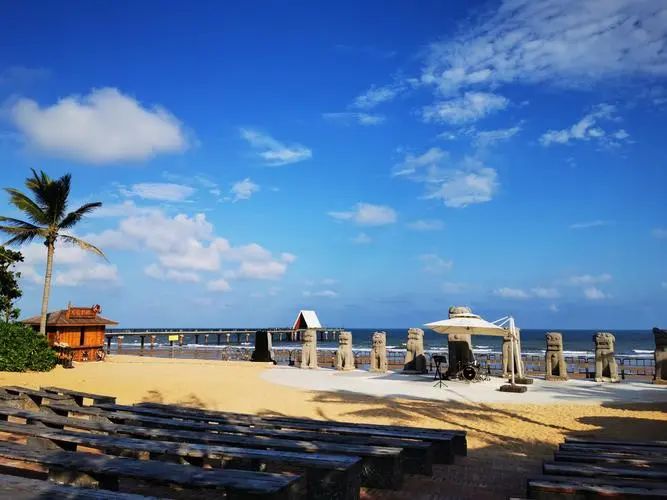 ●【金沙湾】可自由参观“湛江旅游名片 ”,在海滨浴场游泳区,岸边的沙滩上,大人小孩踩着软软的细 沙,或是沙滩漫步,或是追逐、游戏,有的放风筝,有的玩沙雕、有的还踢起了沙滩足球,尽情玩耍,迷 人的椰风海韵吸引大批游客纷至沓来;