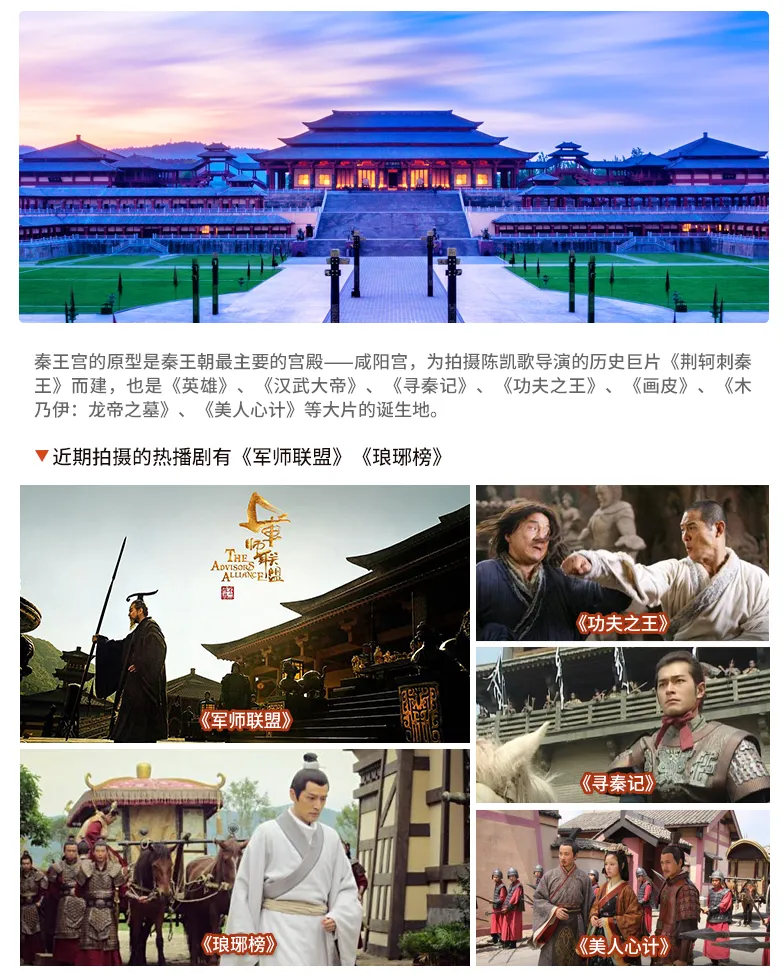 D2: 睡到自然醒,约9:00左右出发游览千秋万世,大秦帝国——【秦王宫景区】(门票180元已含,约1.5H)感受巍峨雄壮,壮阔的校场,矗立的城墙,威严的四海归一殿,在秋曦之下,熠熠生光,走进影视剧中的场景,打卡热门剧《陈情令》—复道,《铜雀台》—99级台阶,《琅琊榜之风起长林》—长廊,《陆贞传奇》—四海归一广场。