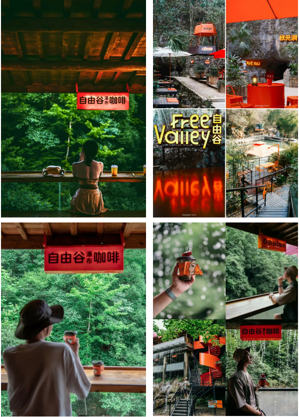 沿着蜿蜒小道前行,便能抵达网红瀑布咖啡区。在磅礴飞瀑前,错落摆放着风情桌椅,品尝咖啡,香气四溢,与清新的自然气息相融。