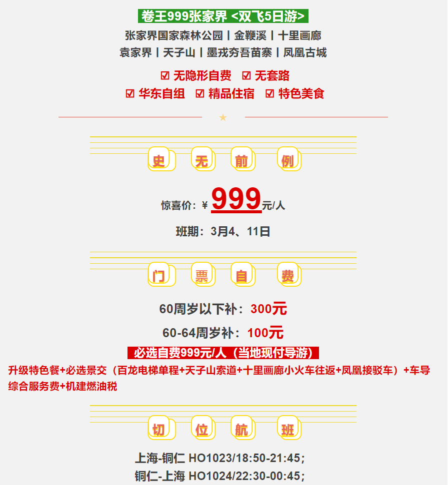3.必选自费999元/人(当地现付导游):升级特色餐+必选景交(百龙电梯单程+天子山索道+十里画廊小火车往返+凤凰接驳车)+车导综合服务费+机建燃油税;