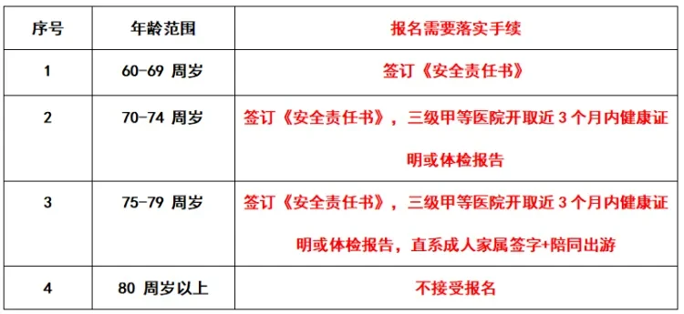 8.70岁-75岁老人需由子女陪同,并且签订免责协议;75岁以上老人考虑安全问题,不接受报名