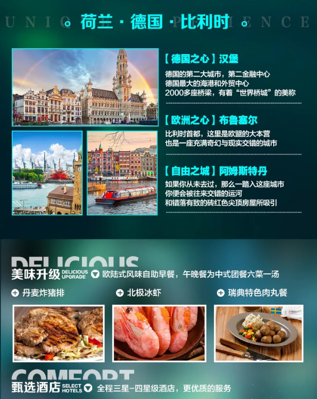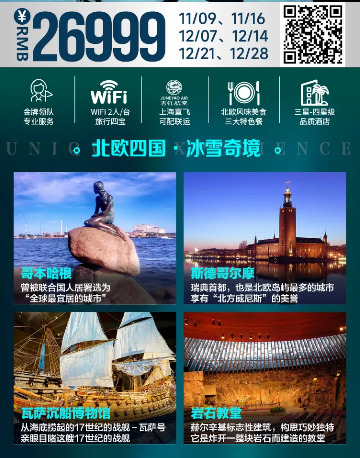 2) 中式午、晚餐(行程中所示中式5顿六菜一汤及北极冰虾;丹麦炸猪排;瑞典肉丸餐,用餐时间在飞机或船上以机船餐为准,不再另退餐费)