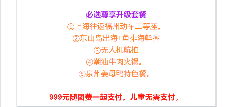 10、“0自费”解释:我社郑重承诺本线路全程不推荐任何自费景点及夜间娱乐项目,但不适用于游客自行自愿所选择的:海上自愿娱乐项目、景区内交通工具及特色演出。在法律允许范围内,最终解释权归福建地接社所有。